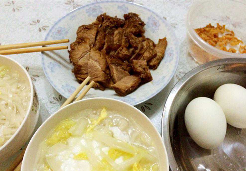 这是红烧肉、鸡蛋面,还额外做了两个蛋,蛋吃了对身体好,我以前就会太不喜欢吃鸡蛋了。