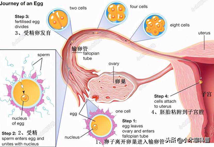 正常情况下,精子和卵子是在女性输卵管内受精,之后逐步发育并移行到子宫进行着床妊娠。详细过程见下图:
