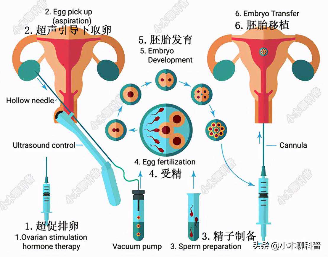 而“试管婴儿”是精子和卵子在体外小试管中受精并发育成胚胎,之后再将其移植回子宫从而获得妊娠的过程,学名为体外受精-胚胎移植(invitrofertilization-embryotransplantation,简称IVF-ET)。具体过程可参照下图: