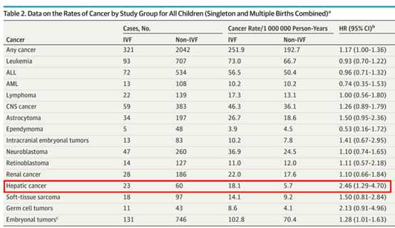 英国的队列研究调查了1992年到2008年的10万名通过IVF受孕出生的儿童,对比了他们与普通人群的肿瘤发生情况。结果显示IVF组儿童肝母细胞瘤和横纹肌肉瘤发生率有所增加。