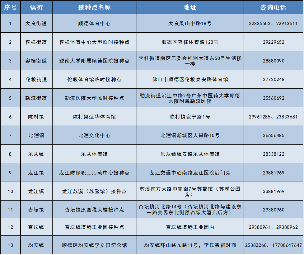 顺德区各镇街新冠病毒大型临时疫苗接种点(固定)