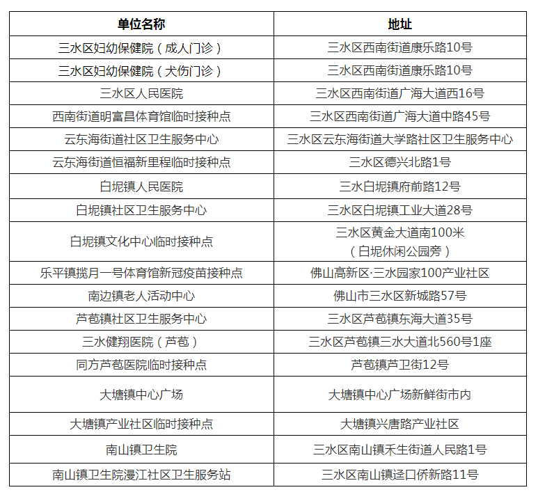 三水区各镇街开放接种点