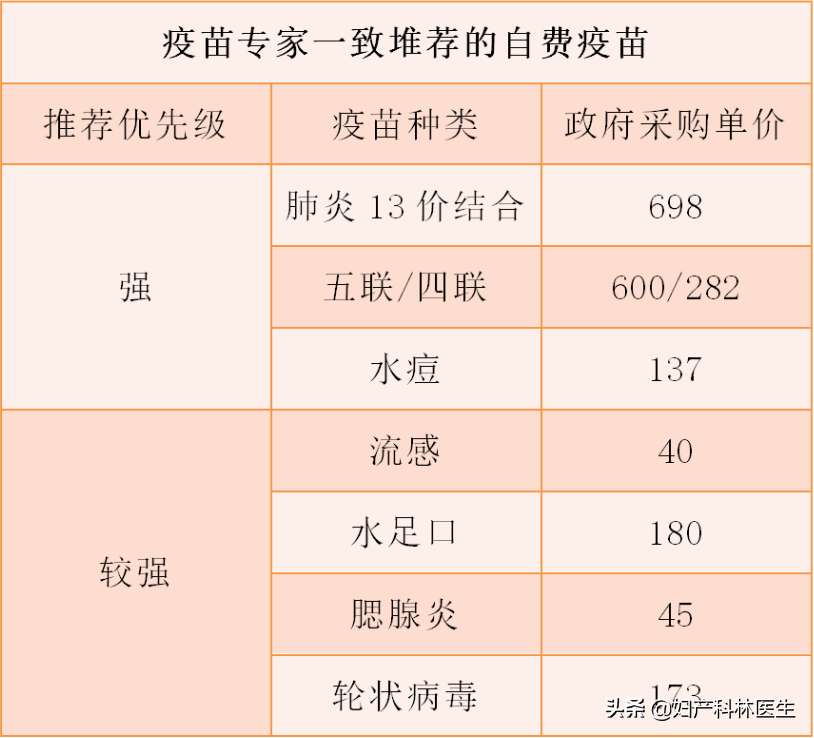因为所有宝妈宝爸对孩子的爱都是百分百的,就怕自己的宝宝错过了什么。其实林医生在这里说一下,自费疫苗表里面的疫苗都是值得花钱接种的。
