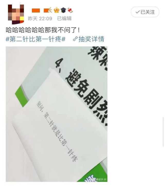 甚至有网友在接种现场拍到了一张提示,上面写道:“别问,第二针就是比第一针疼。”看来接种的工作人员被问了无数遍了。