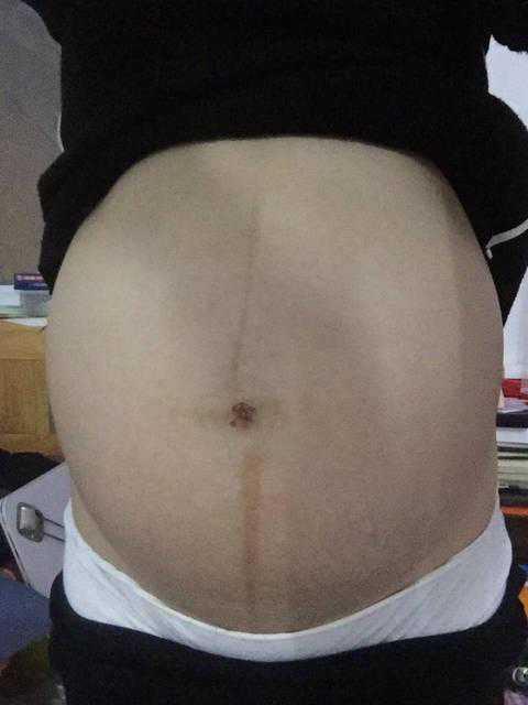 妊娠线上面比下面还要粗,颜色也很深,三个月左右肚子就长出了一些毛毛,到了后期还长出了妊娠纹,但是肚脐眼没有突出来。怀孕以后乳房也变大了很多,乳晕和乳头变得又大又黑。