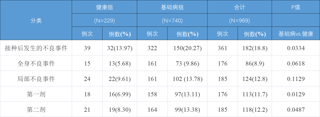 本次研究主要统计了17种与疫苗接种相关的常见不良反应,包括:接种部位疼痛等局部不良反应和疲劳乏力、发热等全身性不良反应。表3中显示,合并基础疾病人群接种疫苗总体不良事(统计学)显著高于健康人群,异幅度约为6%。