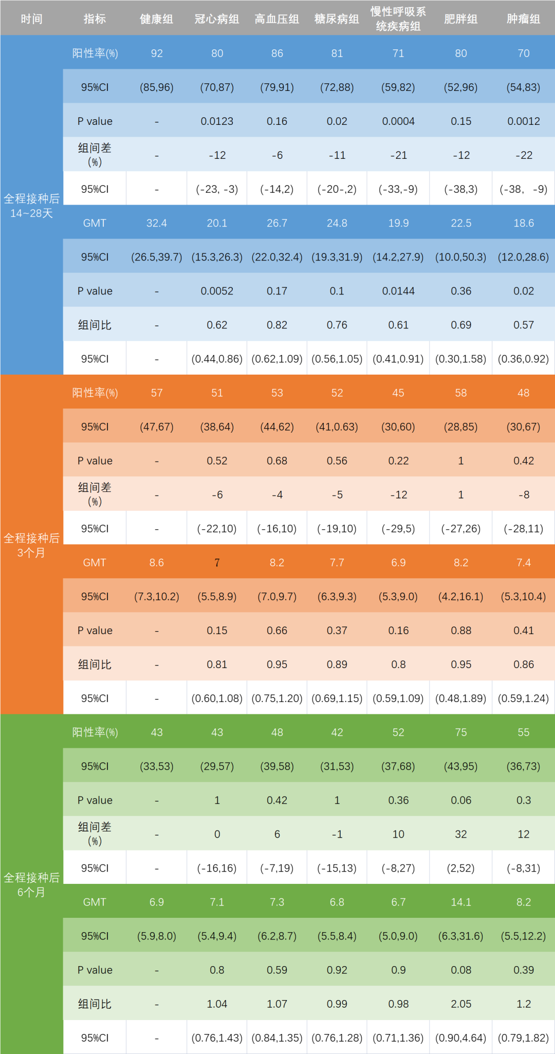 此外,研究还分别在完成免疫接种后3个月、6个月对志愿者进行了血清中和数据显示,在完成全程免疫后(14-28天),血清里中和应答较健康对照显著上升(表2)。3个月和6个月后,健康和基础病人群水平随时间有较快衰减。但3和6个月后,除了高血压和肿瘤患者仍然比健康人群高之外,疾病组和健康组分析
