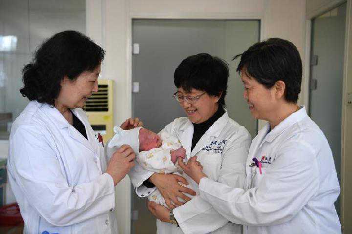 4月15日,中国大陆首例试管婴儿郑萌珠在北京大学第三医院顺利产子,北医三院院长乔杰(中)怀抱新生儿。新华社发(北京大学第三医院供图)