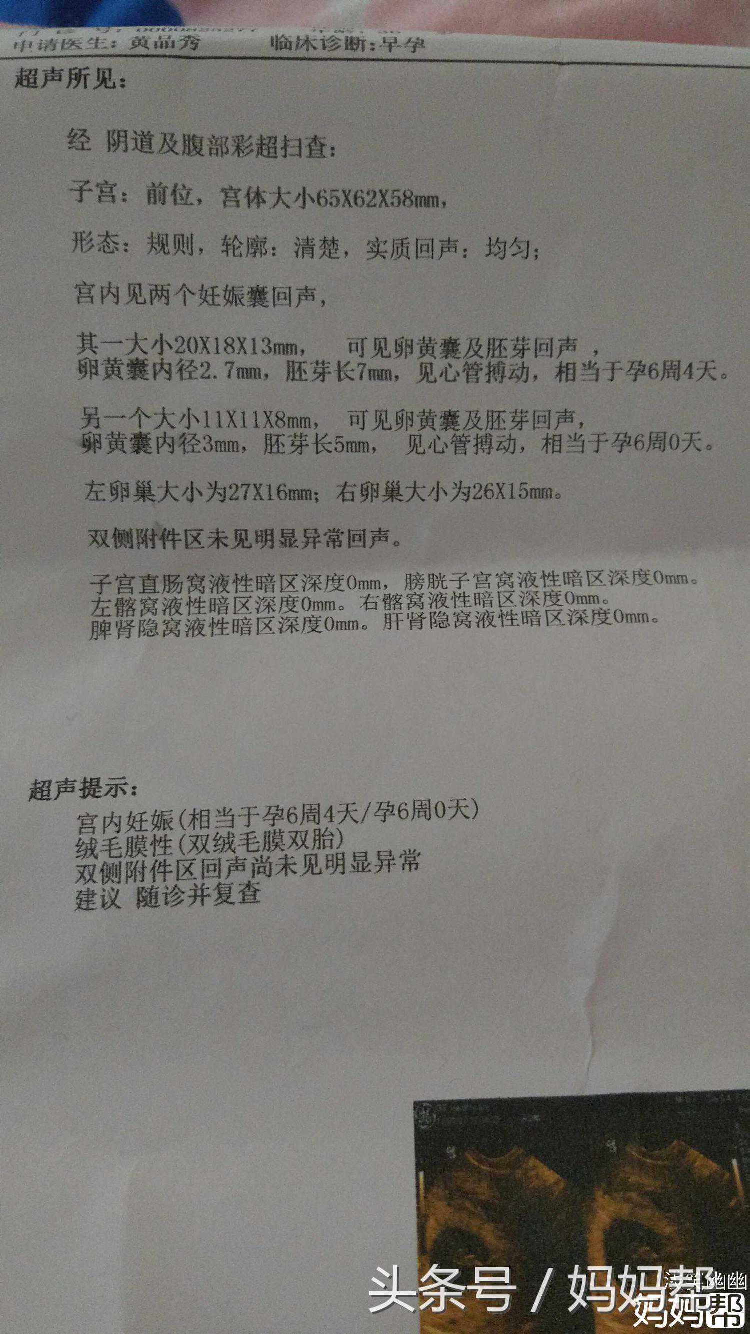 我的血值不是太高,好像单胚的数值,所以我一直以为是单胎。直到今天移植满了30天,按要求做B超排除宫外孕,医生问我移植了几个,我说两个,B超医生说那可以啊,移植两个就接了两个,恭喜啊!当时听了我自己都觉得不可思议,太惊喜了!
